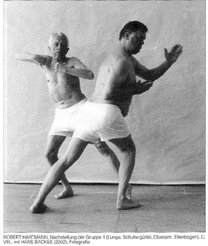 Auf andere Weise zeigt auch die Arbeit von Robert Hartmann und Hans Backes wie Gestus und Pathos dazu geeignet sind, menschliche Realität zu ignorieren. Die Künstler stellen die körperliche Ertüchtigung als Teil der Propaganda der kriegsführenden Gesellschaft nach und verdeutlichen die Brüchigkeit des Ideals ebenso wie das Scheitern am Heldentum.