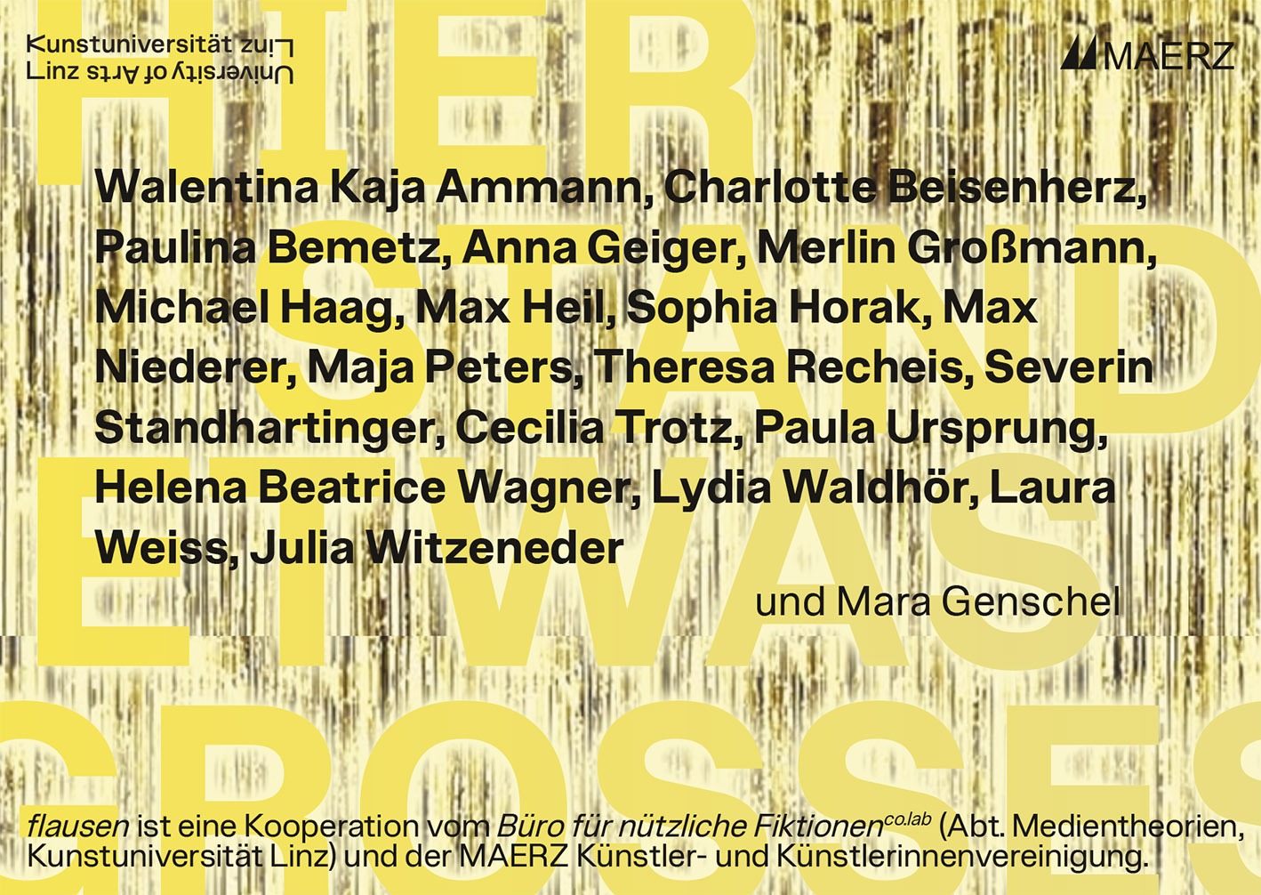 FLAUSEN ist eine Kooperation vom Büro für nützliche Fiktionen co.lab. (Abteilung Medientheorien, Kunstuniversität Linz) und der MAERZ Künstler- und Künstlerinnenvereinigung.