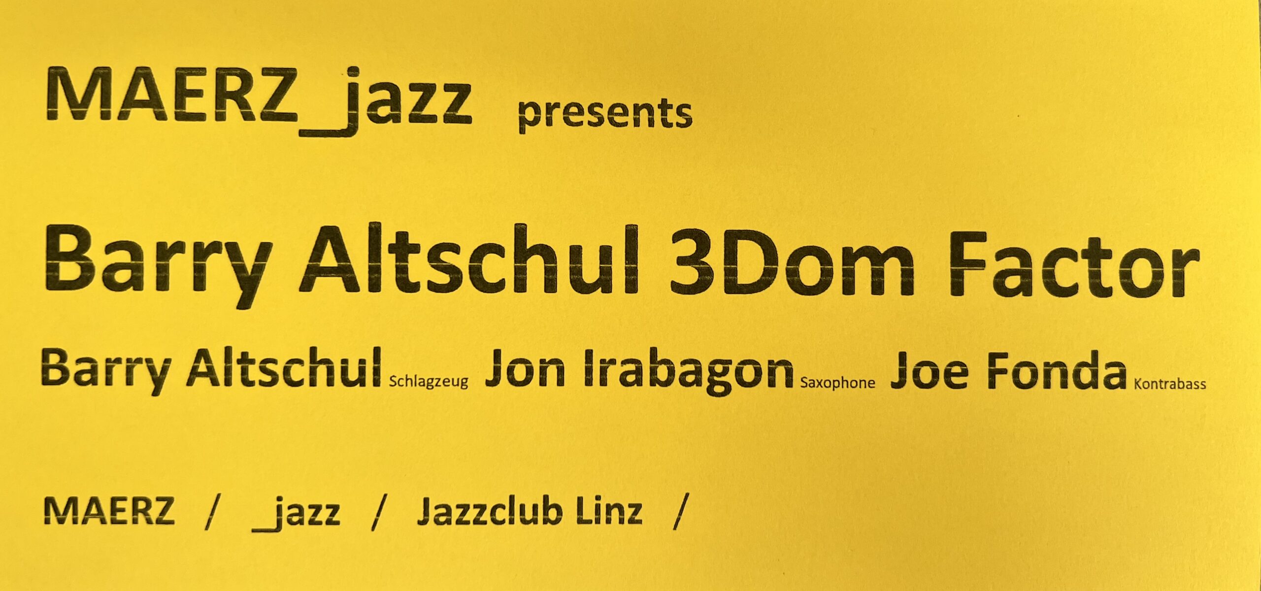 Das formidable 3Dom Factor-Trio des Barry Altschul mit Jon Irabagon und Joe Fonda ist „a complete American music experience“, – und beeindruckte bereits 2014 und 2018 im MAERZ. Barry Altschul brachte es seit den 1960ern als Partner unzähliger Asse, gehörte zum Vorzeige-Trio des Paul Bley, begründete mit Anthony Braxton, Chick Corea und Dave Holland den legendären Circle, schloss mit Billy Bang den famosen FAB-Dreierbund. Und mit dem 2012 vereinten 3Dom Factor-Team erschließt er so energisch wie konsequent neues Potential. Jon Irabagon studierte bei dave Liebman, musizierte mit Kenny Barron, Kris Davis, Ken Vandermark, gewann 2008 die Thelonious Monk Competition. Und Joe Fonda war über 15 Jahre Anthony Braxtons bevorzugter Bassist, vom Orchester bis zum Duett, zudem arbeitete er mit Archie Shepp, Kenny Barron, Dave Douglas, Wadada Leo Smith, Michael Jefry Stevens.