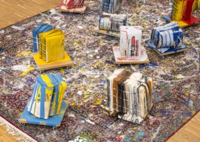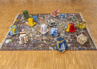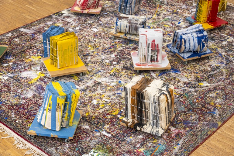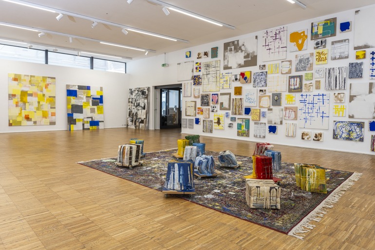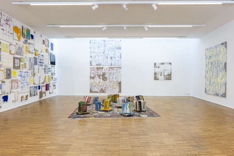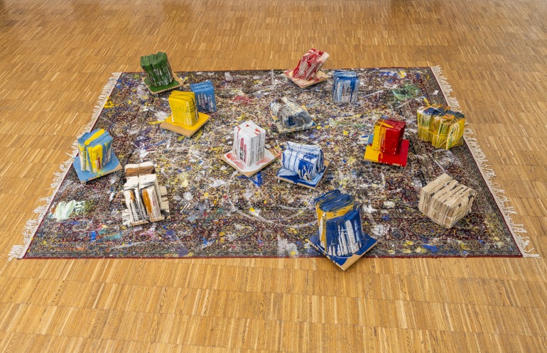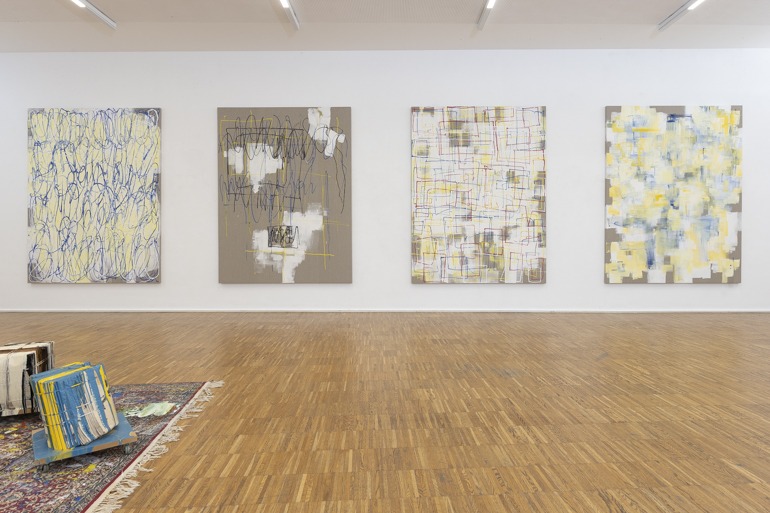 In seiner Ausstellung in der Galerie Maerz setzt Rebhandl großformatige Arbeiten aus den letzten Monaten in Kontext mit einer Auswahl von Objekten und kleineren Bildern aus den vergangenen zwei Jahrzehnten. Ein Teppich, der drei Jahre im Atelier lag und auf dem Spuren der entstandenen Bilder und Objekte zu sehen sind, ist Teil der räumlichen Inszenierung. Er korrespondiert mit den dicht präsentierten Bildern, deren konzeptuelle Harmonie durch Einzelarbeiten, die auf andere Werkgruppen verweisen, kontrastiert wird.
