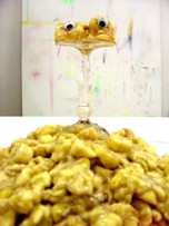 Ronald Kodritsch präsentiert in seiner Ausstellung `The Making Of„ in der Künstlervereinigung MAERZ zum einen großformatige Arbeiten aus der Serie O.T. (Wände), die sich mit der Absenz von Malerei beschäftigen. – Abstraktion mit Heizungsrohren und Boden. Kodritsch malt seine leeren Atelierwände, auf denen die Farbreste der zuvor abgenommenen Bilder zu sehen sind: Farbspritzer, abgedruckte Kanten der Leinwandränder, Spuren des Malprozesses außerhalb des Bildgevierts. Der Zufall, der Abfall, das Nicht-Motiv wird Bildthema und erhält eine neue ästhetisch artifizielle Dimension. Die Arbeiten aus dieser Serie beziehen sich auf die Suche nach dem Motiv; die geteilte Leinwand zeigt das Ergebnis, weist aber andererseits auch auf den Entstehungsprozess hin. Da sich die Farbpalette direkt auf der Leinwand befindet, meint man den Malprozess nachvollziehen zu können. Auch hier spielt Kodritsch mit seiner Liebe zur Hobbymalerei, die die zum Teil banalen Bildmotive erklären.