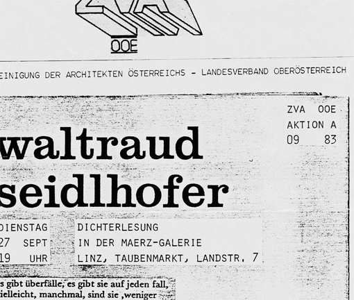 Am 27. September 1983 las Waltraud Seidlhofer in der „Galerie MAERZ“ auf Einladung des Zentralverbands der Architekten Österreichs/Regionalgruppe OÖ bei einer – in Zusammenarbeit des Verbands mit der Künstlervereinigung MAERZ ausgerichteten – Veranstaltung aus ihrem 1976 in der edition neue texte in Linz erschienenen Buch fassadentexte.