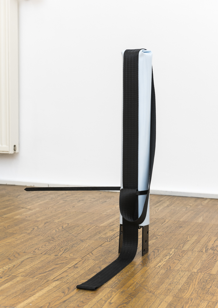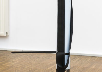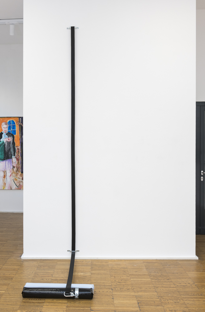 „TOY“ dar, wo das schwarze Gurtband lose auf einem stehenden ,Paketobjekt‘