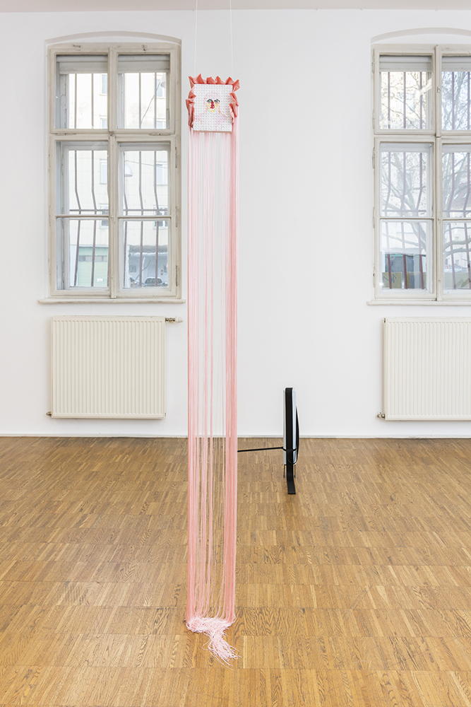 „Portraitziegel“: Lange, babyrosa Polyesterschnüre, die wie Haare, vertikale